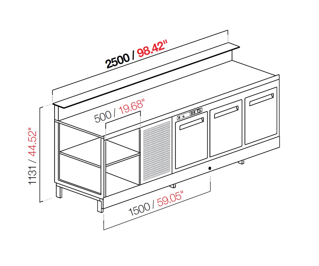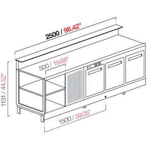 Banco bar refrigerato 250×68,8×113,1h cm.con alzatina più predisposizione per bancalina in marmo/granito/agglomerato (bancalina non inclusa), temperatura di esercizio +4°C/+8°C, refrigerazione statica con evaporatore a scomparsa.