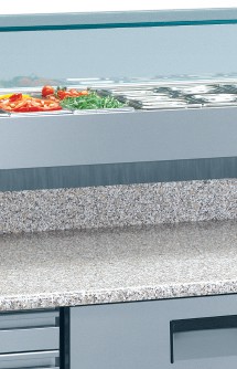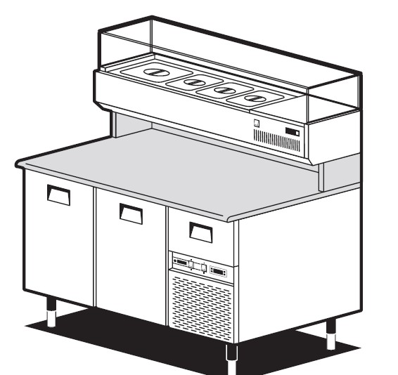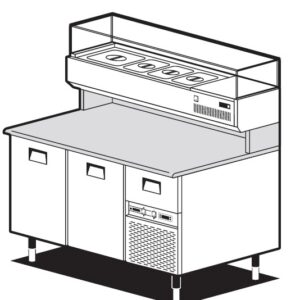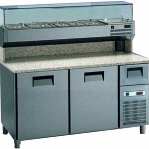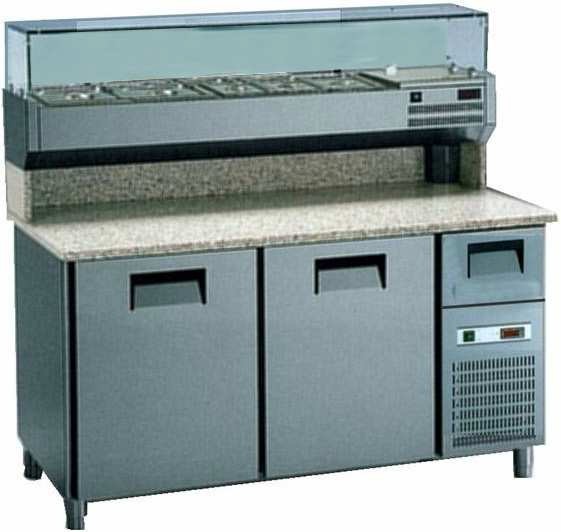 Banco pizza con 2 porte refrigerate (+0°/+8°C) e 1 cassetto neutro, 160x82x150h cm., vetrina portabacinelle refrigerata (+2°/+8°C) con mensola in vetro dritto, piano lavoro 160×82 in granito