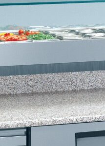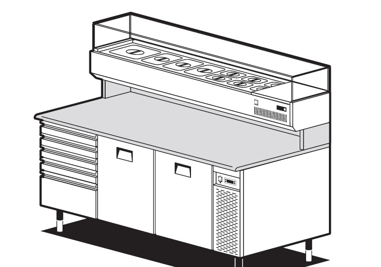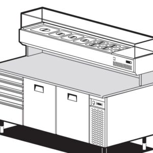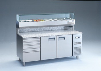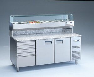 Banco pizza con 2 porte refrigerate (+0°/+8°C) e 1 cassettiera neutra a 5 cassetti con 7 cassette in plastica portapizze, 200x82x150h cm., vetrina portabacinelle refrigerata (+2°/+8°C) con mensola in vetro dritto, piano lavoro 200×82 in granito