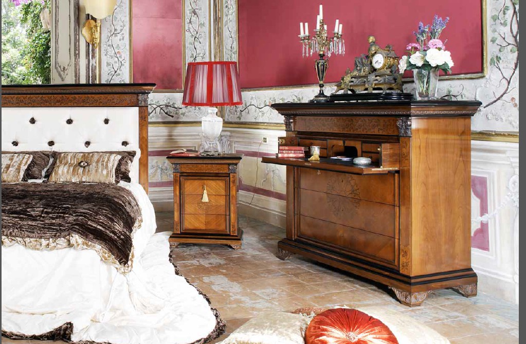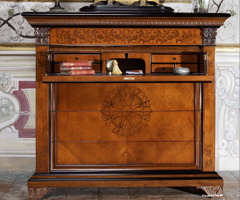 Comò “700” con ribalta, lastronato di Ciliegio con intarsi in Noce ed intagli anticati, 3 cassetti