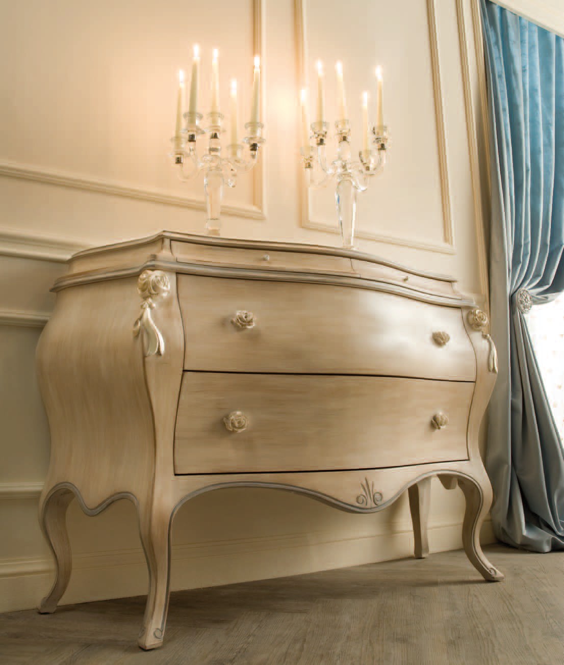 Comò laccato con applicazioni di rose, piano in legno, 4 cassetti (come foto)