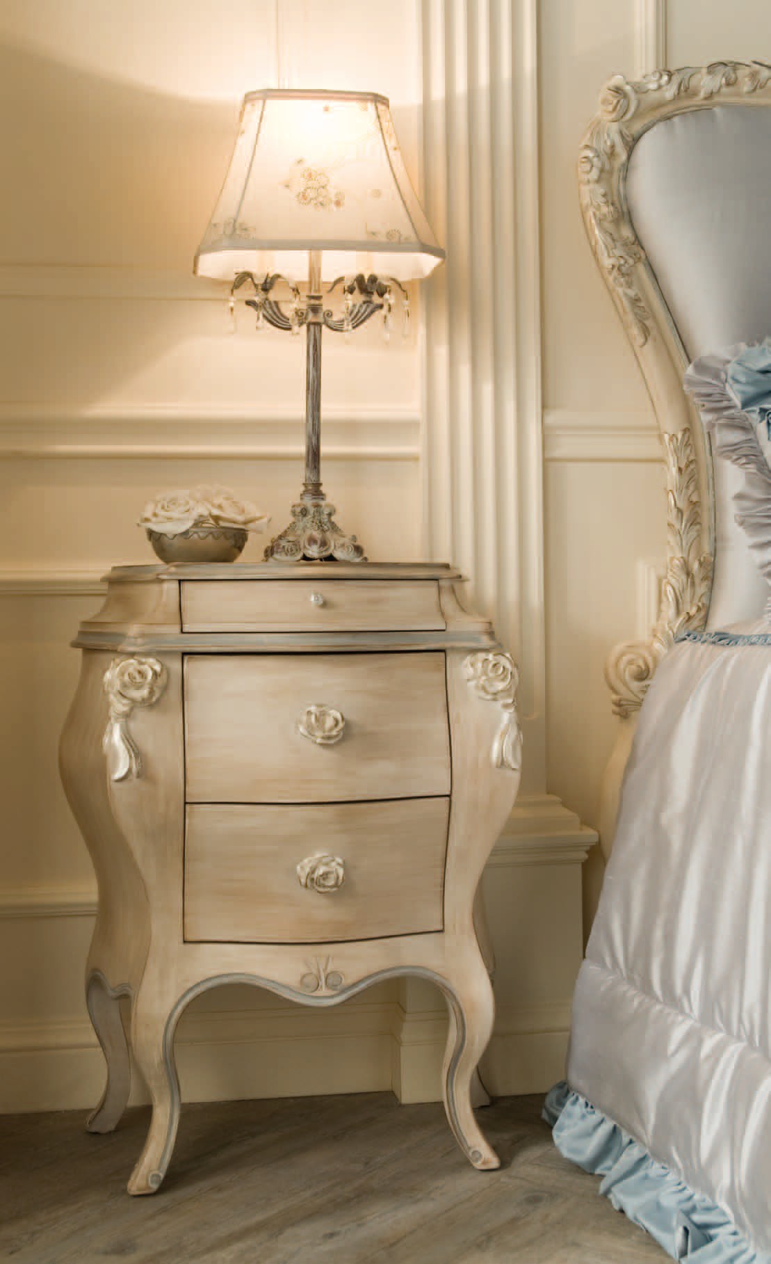 Comodino PRESTIGE laccato con applicazioni di rose, piano in legno, 3 cassetti (come foto)