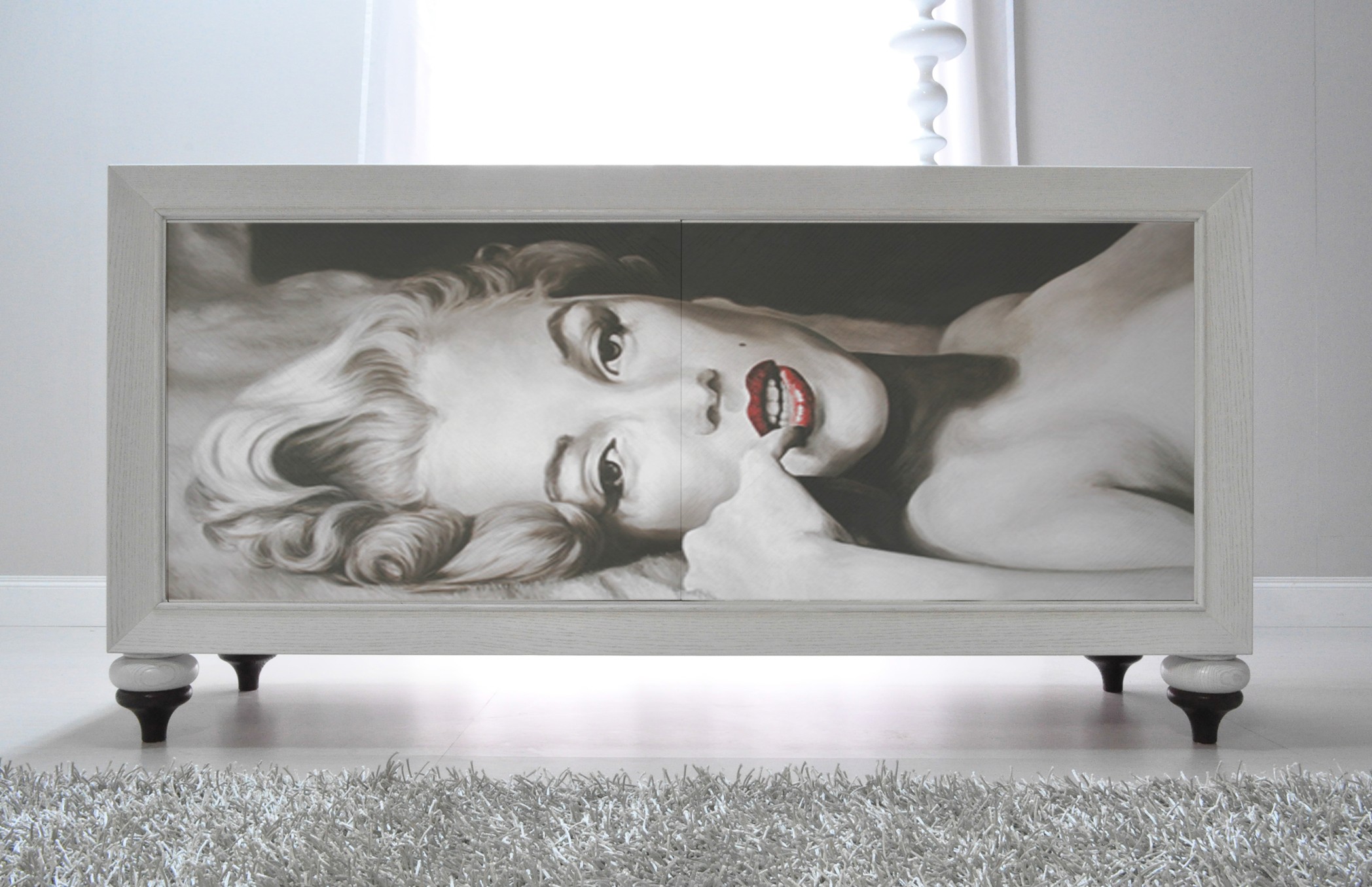 Credenza 2 ante con 1 mensola interna, finitura opaca o lucida, piedi laccati bicolore, portabicchieri estraibile, stampa Marilyn Monroe