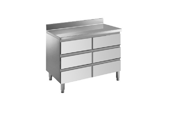 Il piano da lavoro è realizzato in acciaio inox AISI 304 18/10 spessore 1 MM. con alzatina posteriore di 10 CM.