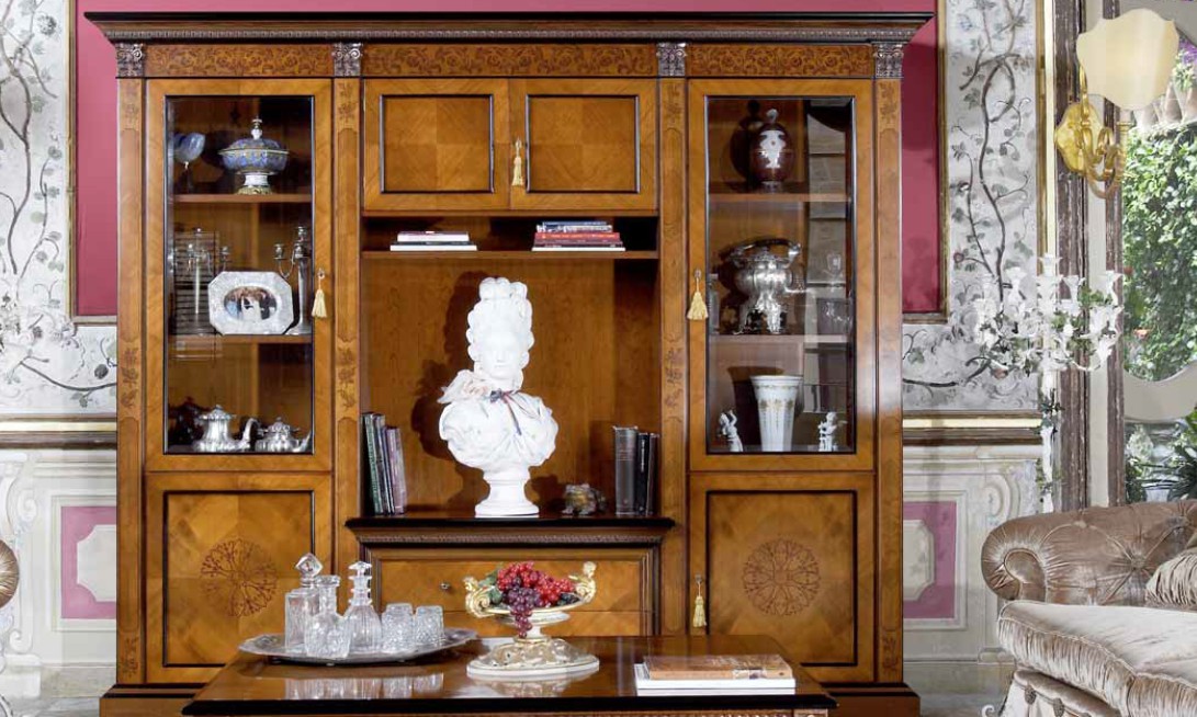 Parete porta tv con vetrine, lastronato di ciliegio con intarsi in noce ed intaglia anticati