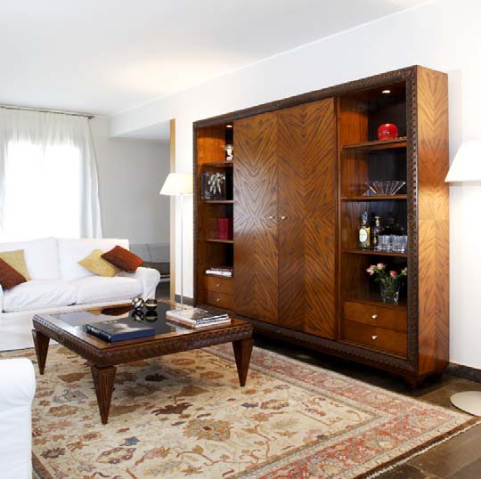 Parete attrezzata DECO’ con 2 ante scorrevoli in Frassino maculato con fascia intagliata argento o oro anticato e 2 faretti nei vani laterali, schiena noce