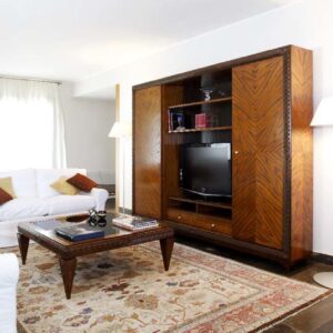 Parete attrezzata DECO’ con 2 ante scorrevoli in Frassino maculato noce con fascia intagliata noce o moka e 2 faretti nei vani laterali, schiena noce