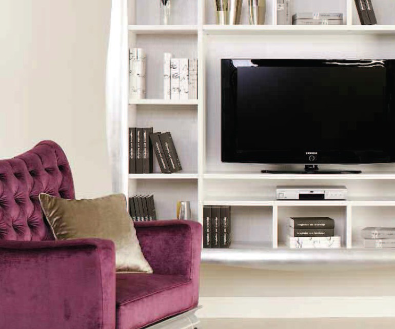 Parete porta TV LCD sospeso, in frassino laccato a poro aperto con dispositivo passa cavi tv e cornice in legno massello