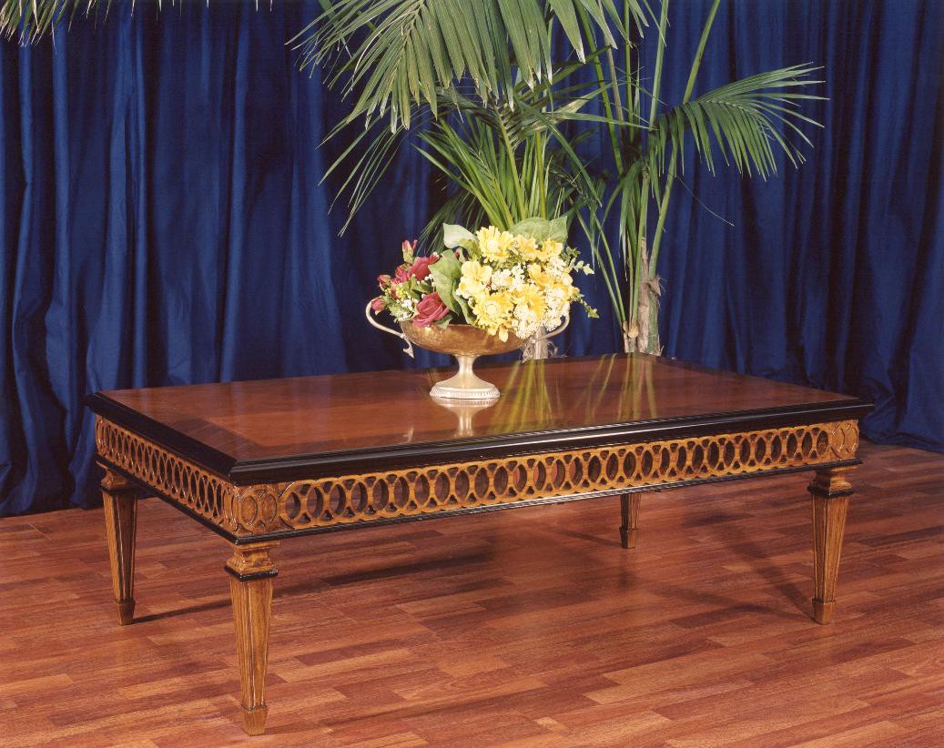 Tavolino rettangolare Neoclassico, traforato a mano, noce e ciliegio anticato, 141x101x48h