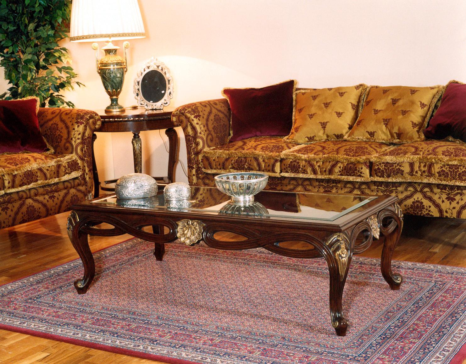 Tavolino rettangolare, piano vetro, intaglio e foglia oro, noce, 140x70x46h