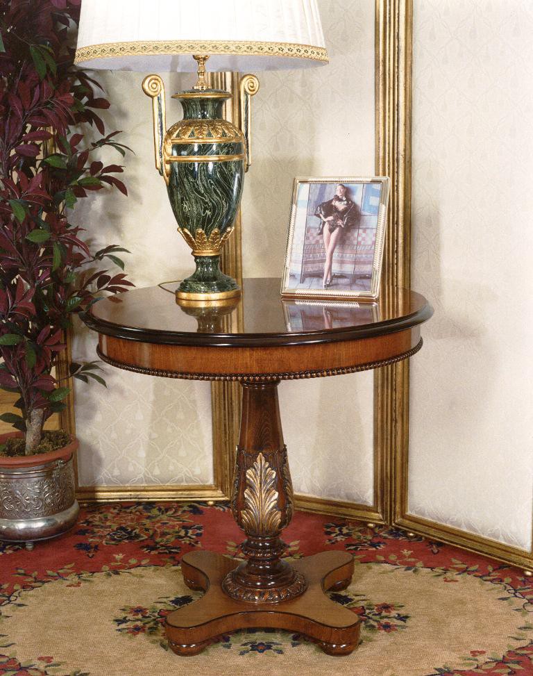 Tavolino tondo con intaglio e foglia oro, ciliegio tinto noce anticato, diam. 76x75h