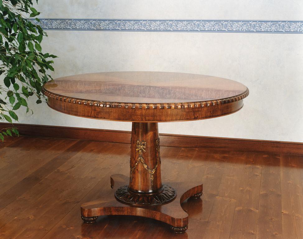 Tavolino tondo con intaglio, ciliegio tinto noce anticato, diam. 120x78h