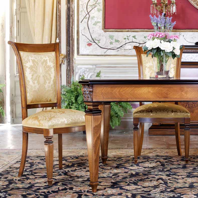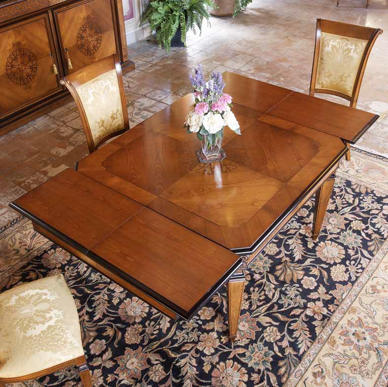 Tavolo quadrato allungabile con 2 prolunghe, lastronato di Ciliegio con intarsi in Noce ed intagli anticati