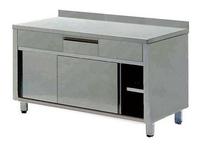 Tavolo armadio inox cm 100x70x85 con alzatina, sportelli scorrevoli e n. 2 cassetti cm 30,5x52x14