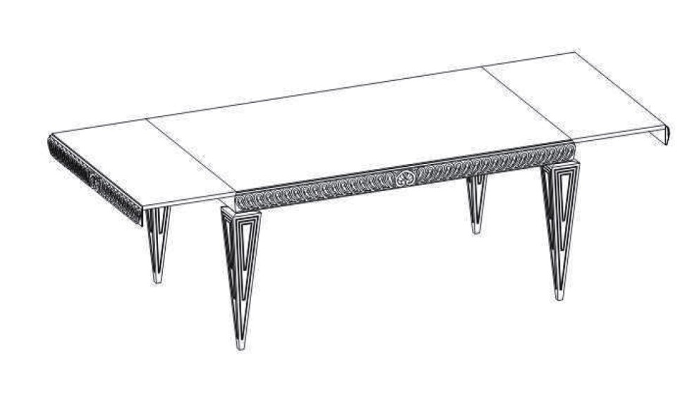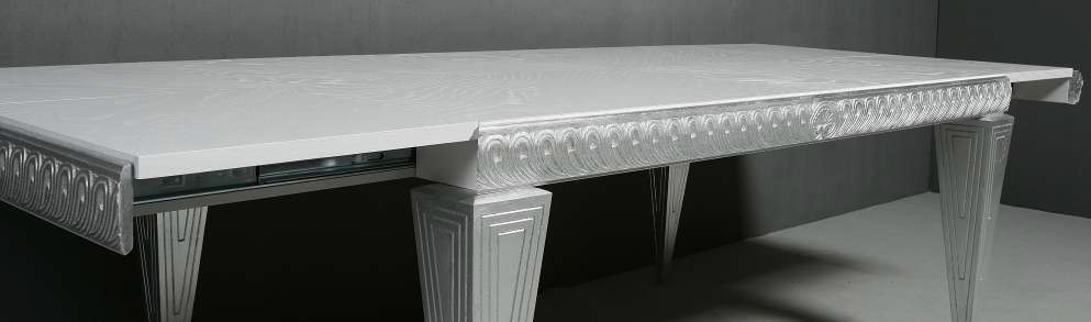 Tavolo quadrato Decò con prolunghe a cassetto da 40 cm., finitura noce con fascia intagliata in Frassino maculato finitura argento o oro anticato e piano in legno