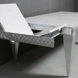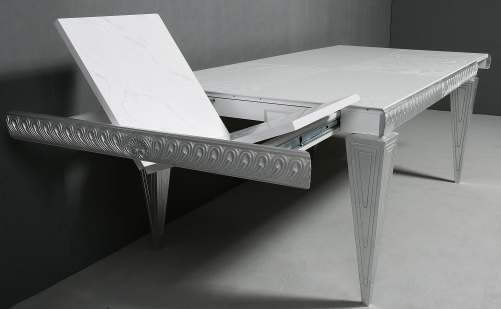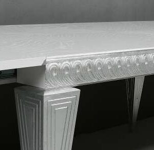 Tavolo quadrato Decò con prolunghe a cassetto da 40 cm., finitura noce con fascia intagliata in Frassino maculato finitura noce o mokae piano in legno