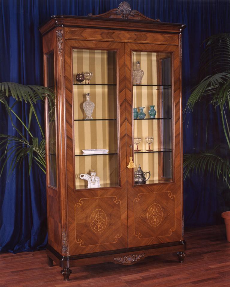 Vetrina 2 ante, con intaglio ed intarsio, segreto nella parte superiore, essenza noce nazionale