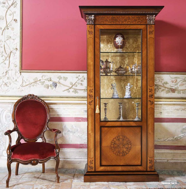 Vetrina 1 anta, lastronato di Ciliegio con intarsi in noce ed intagli anticati