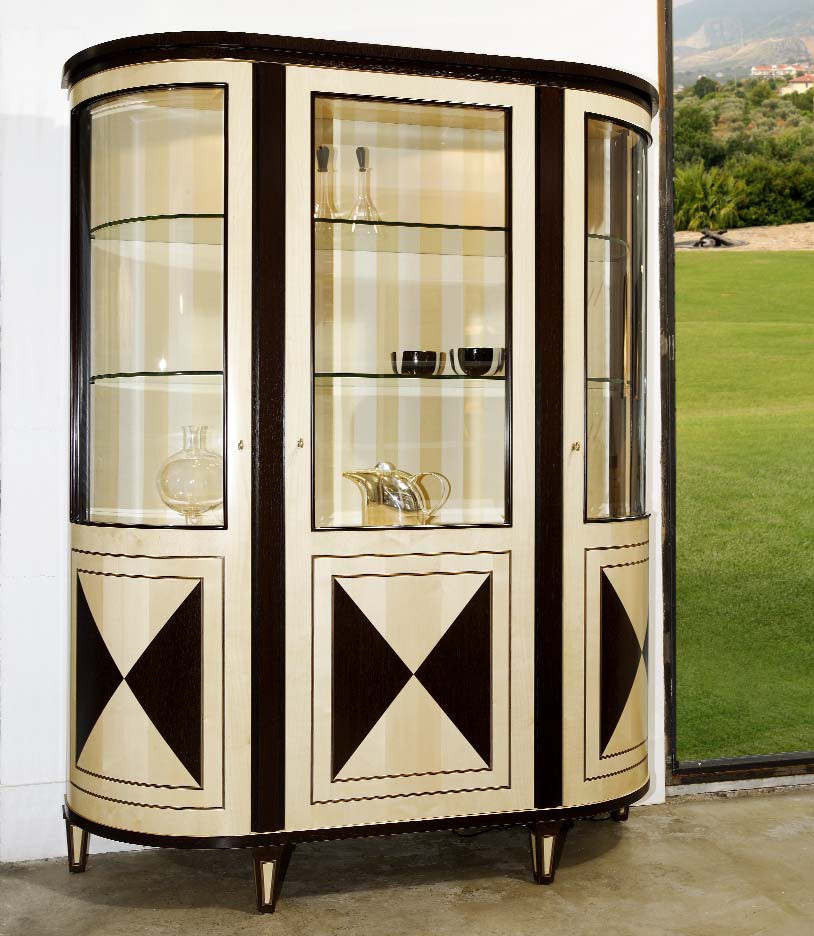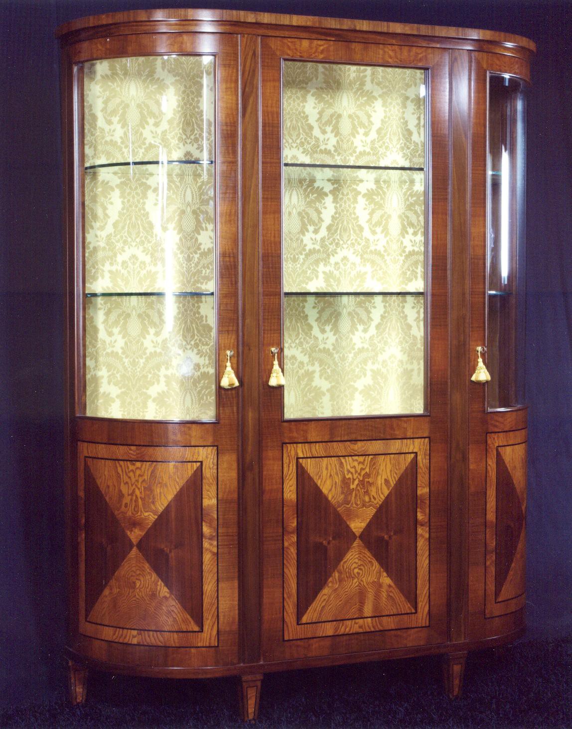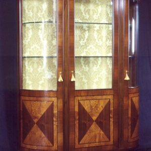 Vetrina ROMA 3 ante acero e wengè con 2 faretti interni, lastronato acero e wengè, schiena con tessuto