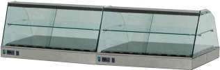 Vetrina inox a 2 settori riscaldati con cristalli curvi, cm. 224x63x55 h da banco, V 230/1V – 50Hz